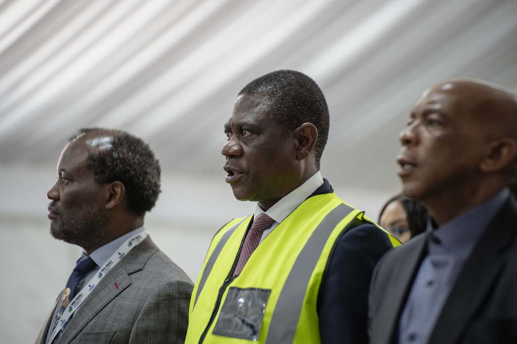 Deputy President Paul Mashatile (centre) attended the launch at Wits, accompanied by other government officials and industry leaders, including Kgosientsho Ramokgopa, Minister of Electricity and Energy (right), and Professor Zeblon Vilakazi, Wits Vice-Chancellor and Principal (left). Photo: Ihsaan Haffejee